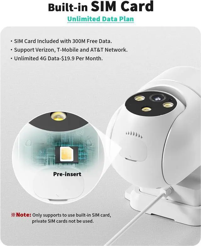 Subscription Required: The SIM card is already installed in the no wifi security camera, and we provide this 4g security camera with complimentary 300MB of data for your testing. This cellular camera requires subscription to get unlimited data. It only $ 19.99 30 days or $ 99.99 180 days and more. (Please check and purchase in the Ubox app). The cellular camera only supports the 4G network in US including Verizon, T-Mobile and AT&T operators.