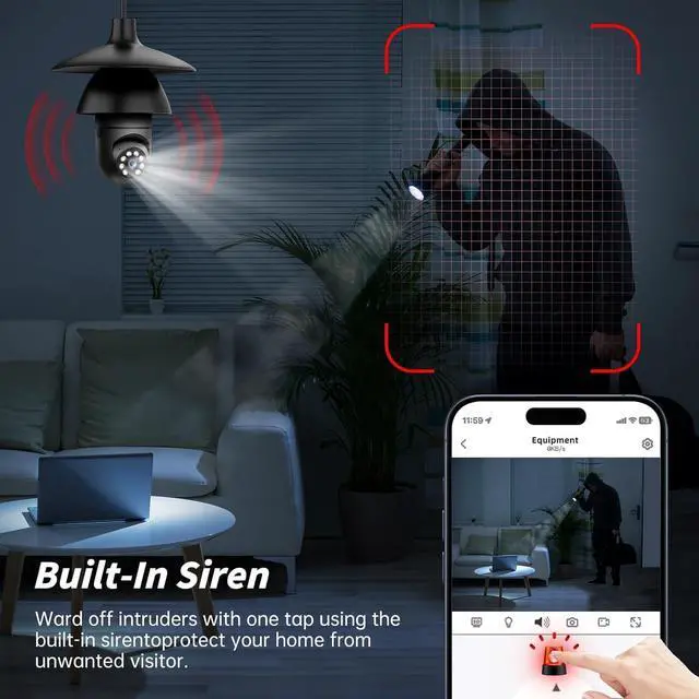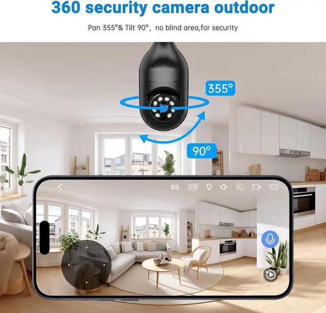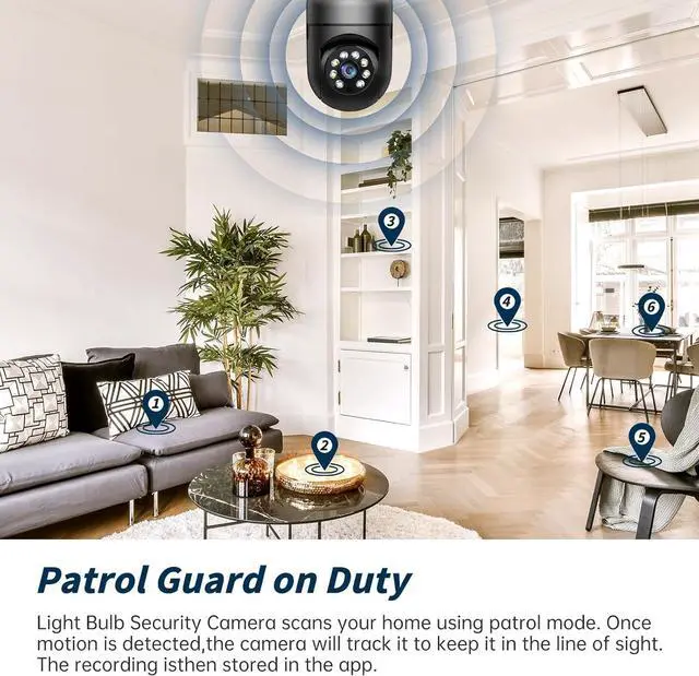 Two-Way Audio & Real-Time AlertsOur light bulb camera built-in microphone and speaker support two-way audio and real-time call, communicate with your family members or visitors without any obstacles, realize face-to-face communication. Our lightbulb security camera can set up an audible alarm, when detecting moving objects lightbulb camera will emit a loud alarm sound and white light at the same time. Scaring away intruder and protecting the family safety. Use a porch light with security camera to discreetly monitor visitors and deliveries.