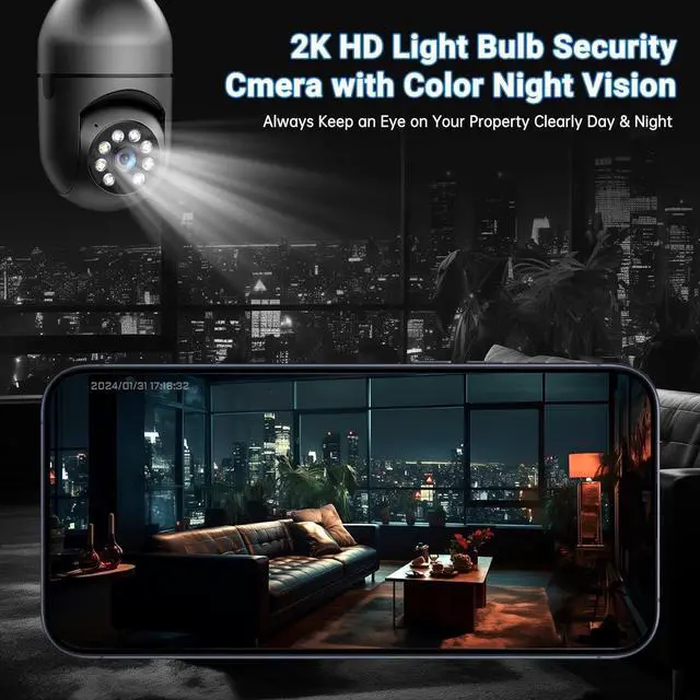 2K HD & Color Night VisionThis light bulb security camera outdoor provides 3MP ultra-high-definition images, which are 40% better than other 1080P pixel lightbulb camera outdoor images. With 4 floodlights and 4 IR lights, three modes of smart night vision, infrared night vision, and full-color night vision can be switched freely at the same time, the outdoor camera wireless allows you to see clearly color images even in the dark.