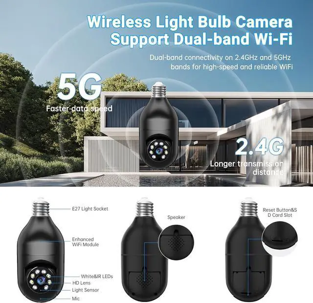 5G & 2.4G Dual-band Wifi Wireless Security CameraOur light bulb security cameras wireless outdoor with the latest 5G & 2.4G dual-band, which have stronger signal reception, higher stability, longer distance to use, no lag and smoother real-time video compared to traditional 2.4G single-band light bulb security camera. Simply screw camera light bulbs outdoor into the equipped E27 bulb base (AC110/240V) and plug it into a power outlet, download the Eseecloud APP and simply connect light bulb camera to your home wifi.