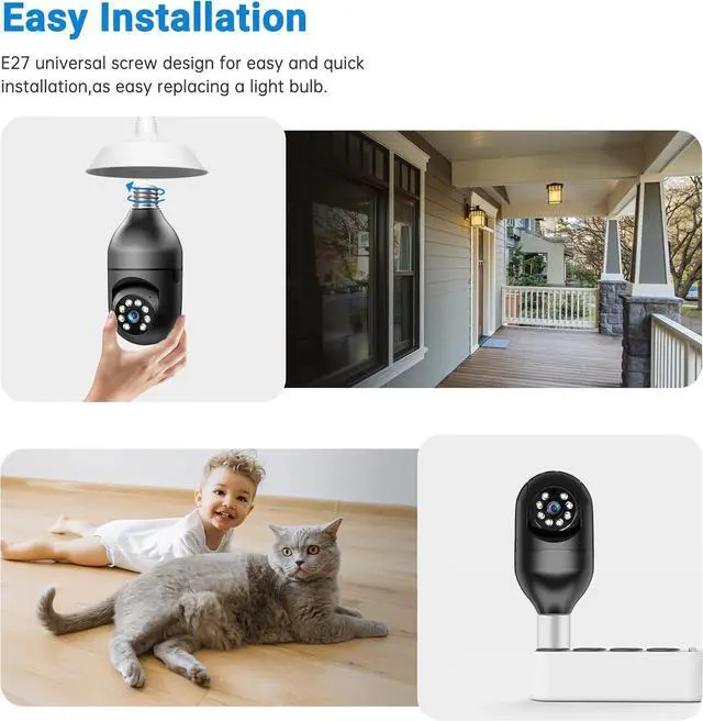 Wireless & Easy Installation This light socket security camera can be installed using a normal E27 bulb base(110V~240V), 100% wireless security camera NO MORE EXTRA INSTALLATION STEPS. then you just need to connect the camera light bulb to the router, open the app to setup the camera within minutes. Our light socket camera integrates seamlessly into your home, providing top-notch security with minimal effort.