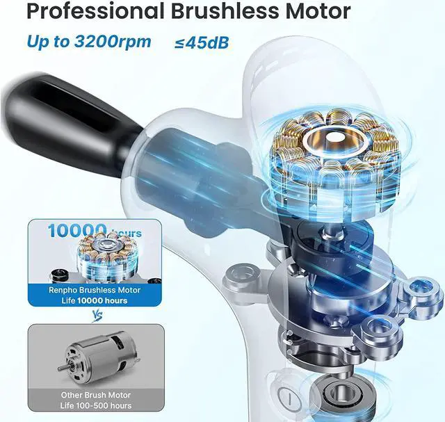 Low noise: With a low noise brushless motor, the handheld massager gun works on less than 45 dB. A super quiet portable massage gun for women or office man to help relax muscles and relieve pain from prolonged sitting. You can enjoy relaxation time in quiet.