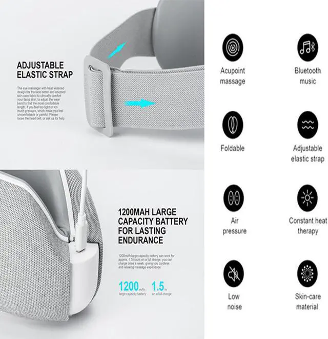 The eye massager with double airbags around eyes compression massage to appoint massage with heat temperature around 38-42° to help improve circulation around the eye, effectively to reduce eye strain, relieves ocular issue, relief headaches and head relax.