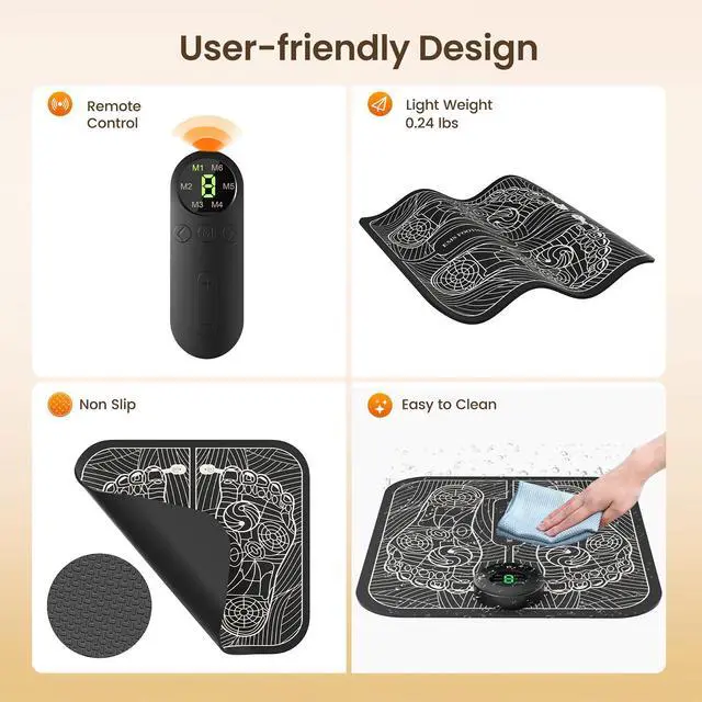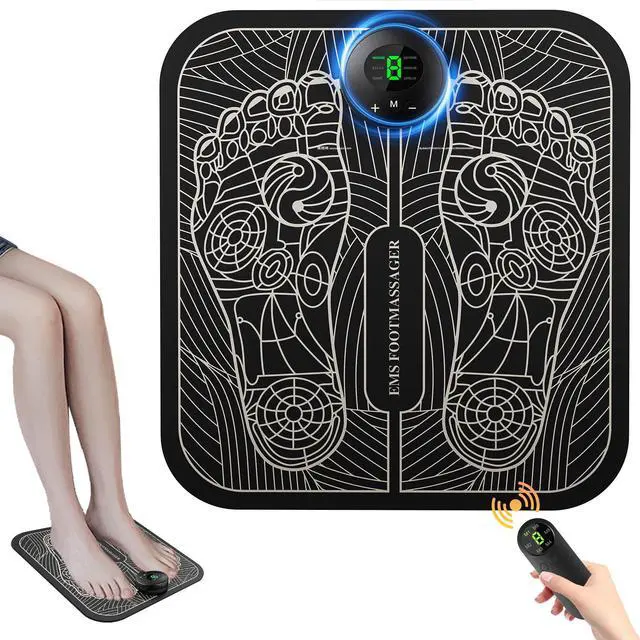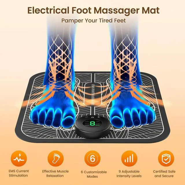Experience targeted relief and relaxation with our innovative EMS Foot Massager Mat. Crafted for versatility, its compact and foldable design (12.6" x 11.4") ensures easy storage and portability, making it your ideal companion for home, work, or travel. Utilizing advanced Electrical Muscle Stimulation (EMS) technology, the massager emits gentle electrical pulses to stimulate motor neurons, encouraging deep muscle contractions that alleviate discomfort from neuropathy, plantar fasciitis, cramps, and swelling. Boost circulation, support muscle recovery, and unwind with 6 specialized modessuch as kneading, scraping, and cuppingcoupled with 9 intensity levels for a fully personalized experience.