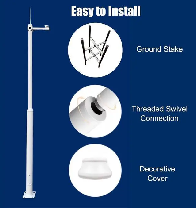Easy to Install It can be assembled and installed quickly and efficiently without specialized tools. The two-section pole has a threaded connector, which can be tightened to make a tight connection. The package comes with a ground stake and screws that can be easily on the ground