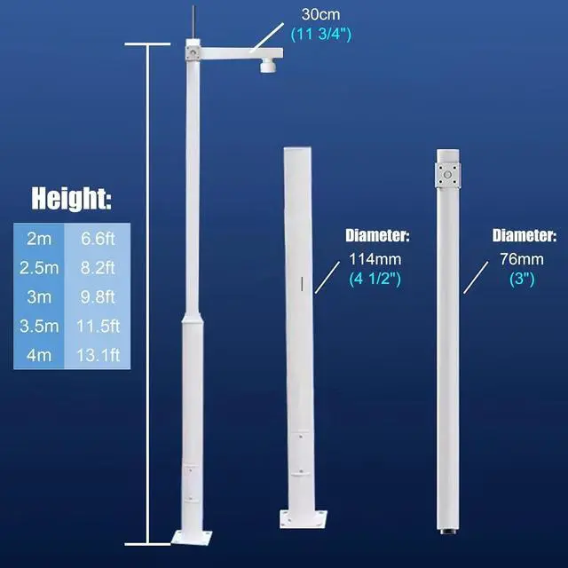 • Dimensions Length available in 2m (6.6ft) , 2.5m (8.2ft) , 3m (9.8ft) , 3.5m (11.5ft) , 4m(13.1ft). The top half of the post is 76mm (3") in diameter, and the bottom half is 114mm (4 1/2"). The length of the cross arm is 30cm (11 3/4")