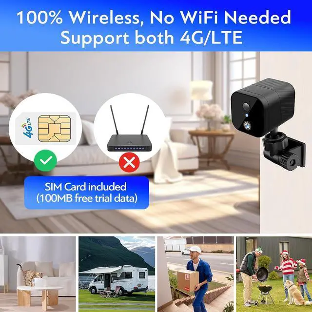 4G LTE Connectivity, No WiFi Required: This security camera operates on 4G LTE networks, making it ideal for remote locations without WiFi. It comes with a dedicated SIM card and includes 100MB of trial data, compatible with AT&T, T-Mobile, and Verizon networks (US only).