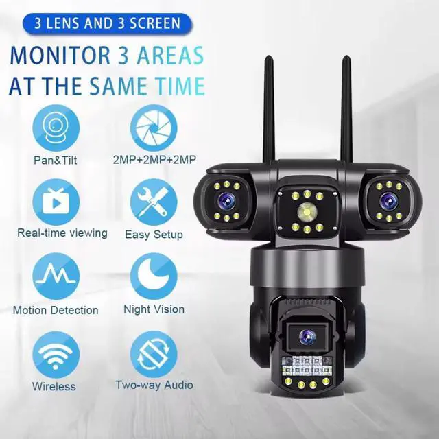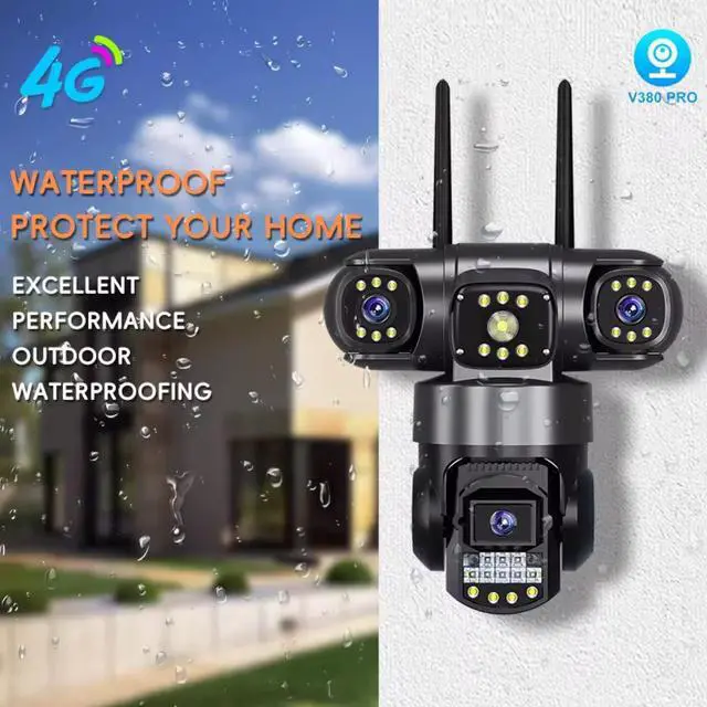 Monitor three areas simultaneously with the V380 4G/WiFi Outdoor Security Camera. Featuring triple 2MP lenses for tri-screen viewing, 360° PTZ control, and dual connectivity (4G+WiFi), this advanced outdoor camera delivers comprehensive surveillance for homes, yards, and properties.