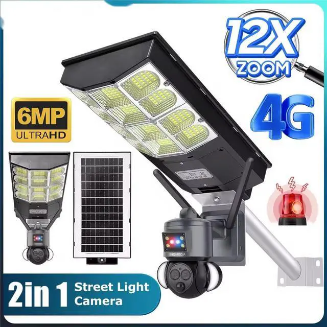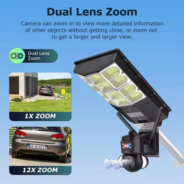 Illuminate and secure your property with this 4G Solar Street Light Security Camera. Featuring dual-lens 6MP night vision, 12X zoom, and motion-activated LED light, this off-grid camera provides complete surveillance for remote locations