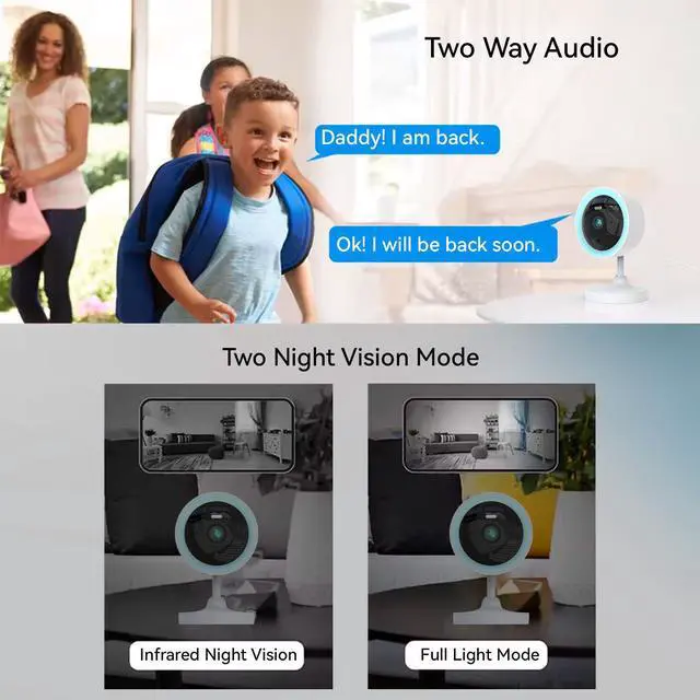Two-Way Audio: Built-in microphone and speaker for real-time communicationtalk to family members or deter intruders remotely.