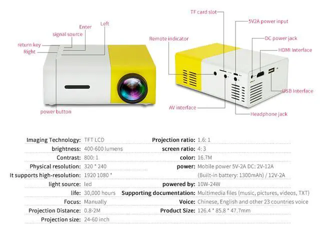 4. Performance: 400-600 Lumens; Native resolution: 320x240 pixels; Support resolution: 1080P; Aspect ratio: 4:3 or 16:9; Projection distance: 0.8-2m; Projection size up to 60 inches; Power consumption is 10-24w.
