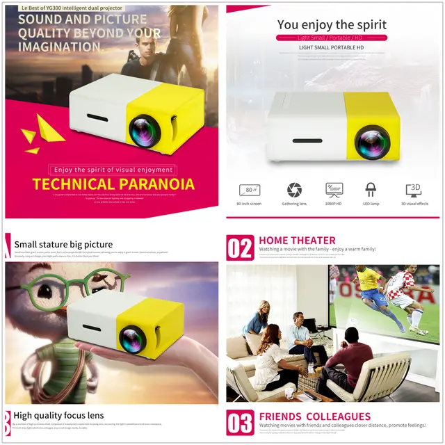 Mini projector YG300 can enhance your entertainment experience with movies, TV, gaming, and music. Boundless joy derives from this entertainment projector. Perfect for your family entertainment, watch cartoon movies, or view your favorite family clips straight from your camera, and also great toy projector for kids play and education.