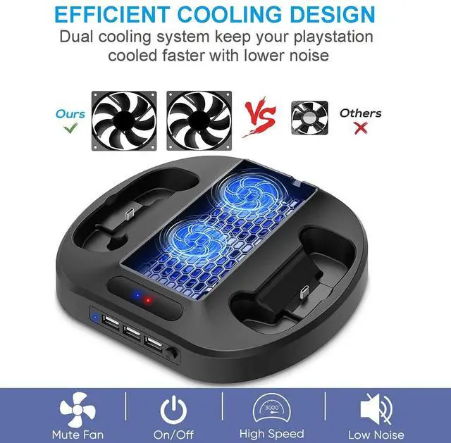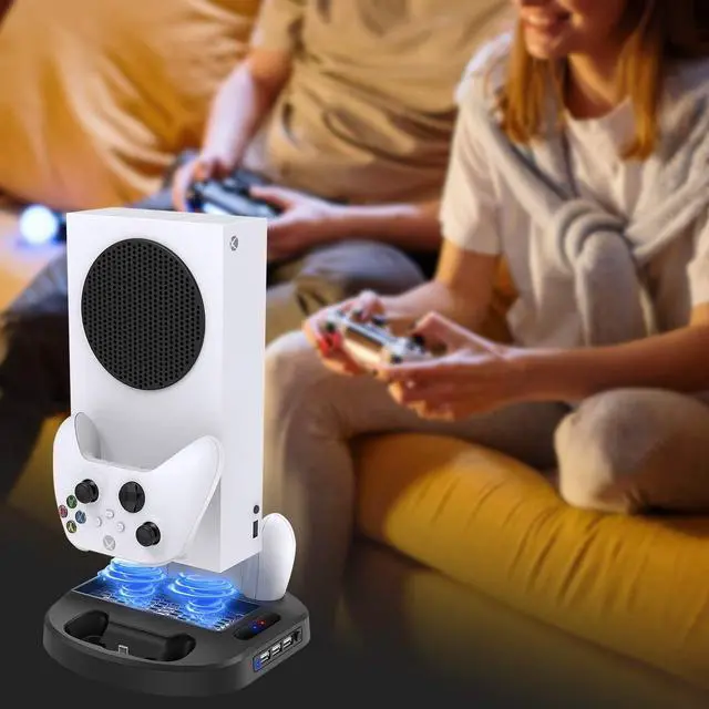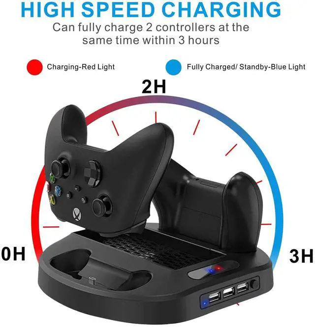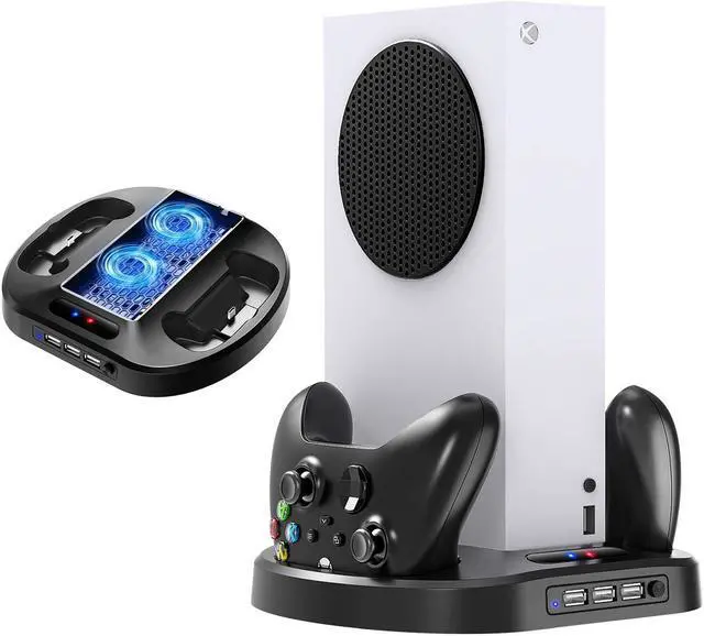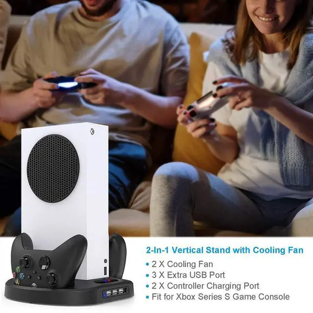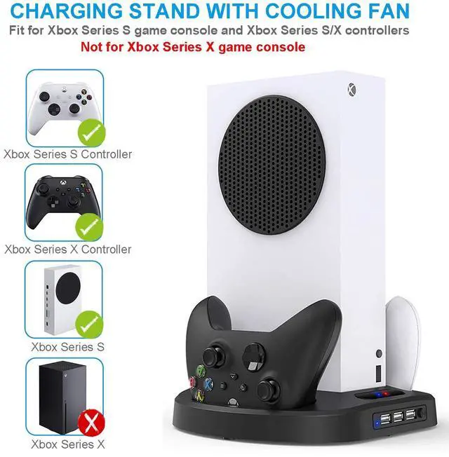 Cooling fan design for Xbox Series S game console, this Xbox Series S/X controller charger also can charge 2pcs Xbox Series S/X controllers at the same time.