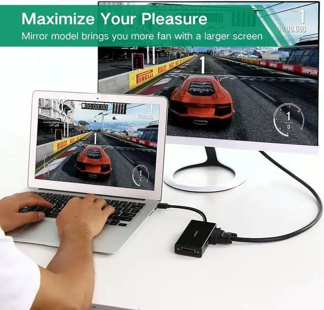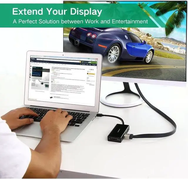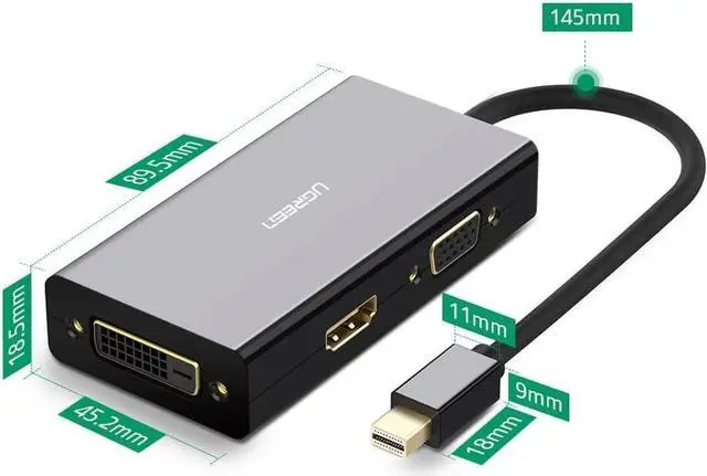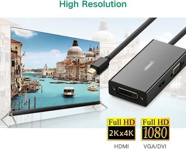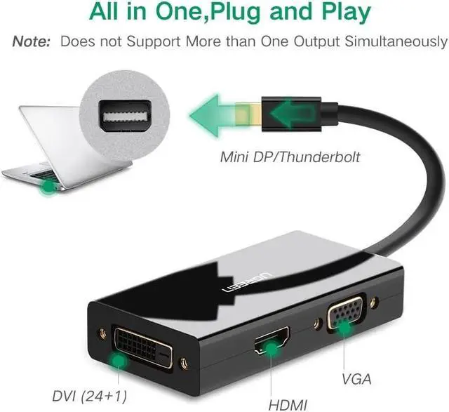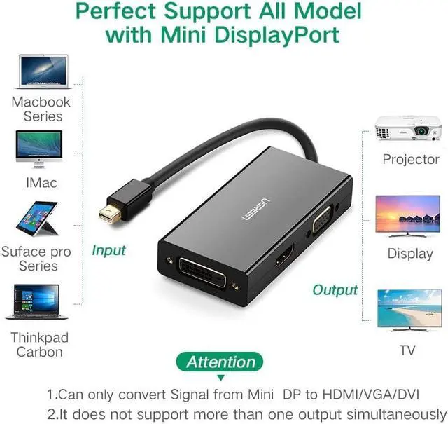 UGREEN Mini DisplayPort to HDMI DVI VGA Adapter connects a Mini DisplayPort/Mini DP/Thunderbolt 2.0 Port compatible computer or MacBook to an HDTV monitor or projector with HDMI/VGA/DVI port. A separate HDMI/VGA/VGA cable(sold separately) is required. IMPORTANT NOTES: HDMI VGA and DVI port can't be used simultaneously. Only one of them could be used at a time. Supports 4K High Rresolution: mini dp to hdmi vga dvi converter supports up to 4Kx2K@30Hz (HDMI) 1080p@60Hz and 1920x1200 (DVI & VGA) display resolutions and flawless audio pass-thru for uncompressed digital 7.1 5.1 or 2 channels (Audio is NOT supported for DVI & VGA output); Don't fit with thunderbolt 3.0 or any USB C Port Device! Mirror or Extend Laptop: this 3 in 1 mini dp adapter transmits both audio and video from computer or tablet to HD display via HDMI. With this 4K resolution converter you can easily add an external display to mirror or extend your computer then you are free to enjoy favorite movies YouTube clips iTunes songs watch Netflix and movies on big screen. The mini displayport thunderbolt to HDMI DVI VGA adapter is ideal for business home entertainment conference rooms and more; Triple Shielding for Good Signal Performance: Gold-plated connectors and triple shielding of this mini displayport to hdmi vga dvi converter ensures max conductivity and signal performance. Molded strain-relief prolongs it's service life; Broad Compatibility: Compatible with Apple MacBook MacBook Pro MacBook Air iMac Mac mini Mac Pro; Microsoft Surface Pro 4 Pro 3 Pro 2 Surfacebook (NOT Surface for Windows RT); Lenovo ThinkPad X1 Carbon X230/X240s L540 T540p W540 Helix; Dell XPS 13/14/15/17 Latitude E7240/E7440 Precision M3800; Alienware 14/17/18; Acer Aspire R7/S7/V5/V7; Intel NUC; Asus Zenbook; HP Envy 14/17; Google Chromebook Pixel; Cyberpower Zeusbook Edge X6; Toshiba Satellite Pro S500 Tecra M11/A11.
