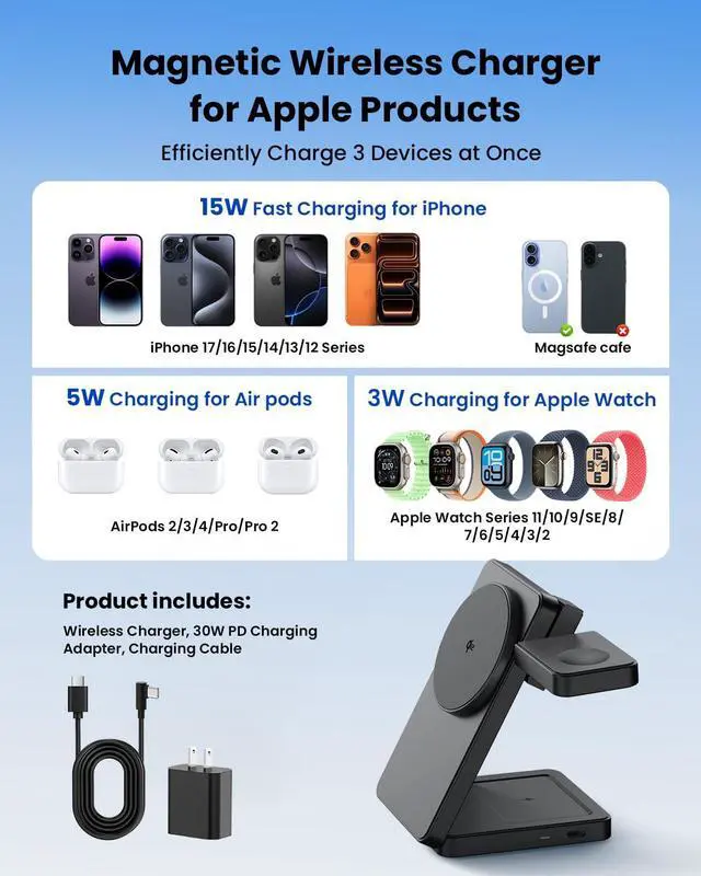 This wireless charger is designed exclusively for MagSafe-compatible iPhones (iPhone 12 and later). Cases thicker than 4 mm or made of non-magnetic materials may reduce charging performance and are not recommended.