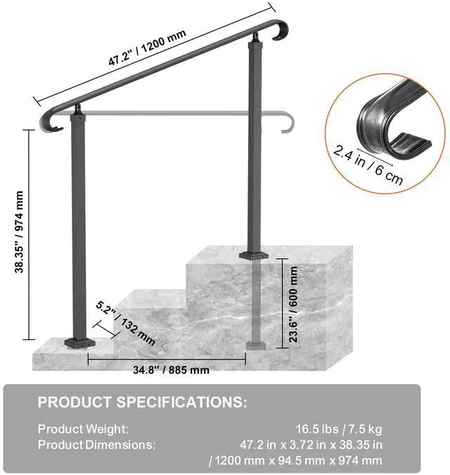 Model: LTFS- 1.2MLZ Material: Wrought Iron Steps: 2 Max Height for Steps: 23.6 in/60 cm Distance Between Posts: 34.8 in/ 88.5 cm Post Height: 38.35" / 97.4 cm Color: Black Product Weight: 16.5 lbs/ 7.5 kg