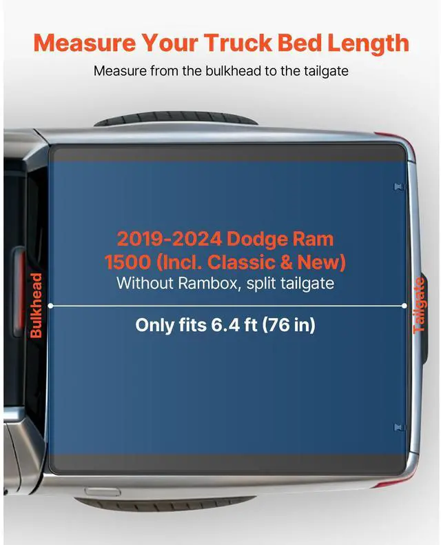 Soft Quad-Fold Truck Bed Tonneau Cover, Compatible with 2019-2024 Dodge Ram 1500 (Incl. Classic & New) 6.4 ft (76 in) Bed Without Rambox, Split Tailgate, Waterproof Folding Truck Tonneau Cover