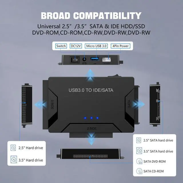 This USB 3.0 to IDE/SATA adapter is an efficient data management tool designed to address the need for data interoperability between old and new hard drives. Its core features include high-speed transmission, multi-device compatibility, and flexible expansion: equipped with a USB 3.0 interface that supports a maximum transmission rate of 5Gbps, it enables fast backup of large files or cross-device data migration, while being backward compatible with USB 2.0/1.1; it features 1 SATA III port and 2 IDE ports, compatible with 2.5"/3.5" HDDs and SSDs, supporting a single drive with a maximum capacity of 20TB, and allowing simultaneous reading and writing to 3 drives to enhance work efficiency.