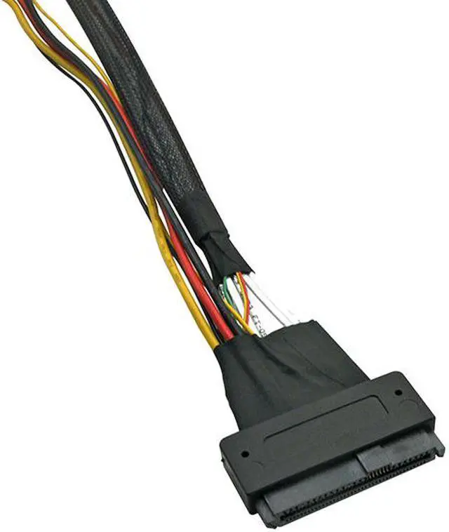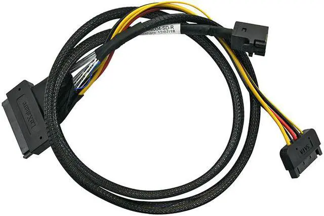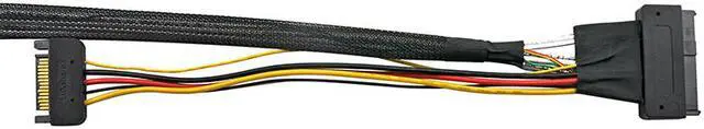 12GB/s Mini SAS HD 4i Plug (SFF-8643 36P) to U. 2 Plug (SFF-8639 68P) Cable with SATA Power Connector 1: 1 x SFF-8643 male; Connector 2: 1 x U. 2 SFF-8639 male+1 x SATA 15 pin female