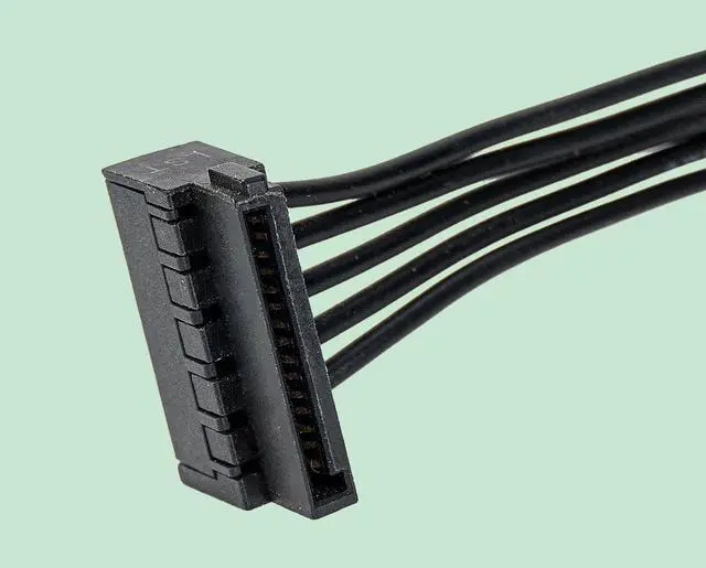 SATA power distribution cable: One SATA power plug to four SATA power supply cables, one SATA 15pin power plug for computer power supplies, 4 SATA 15pin sockets for HDD, SSD, DVD, optical drives and PCIE cards.