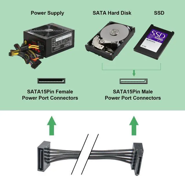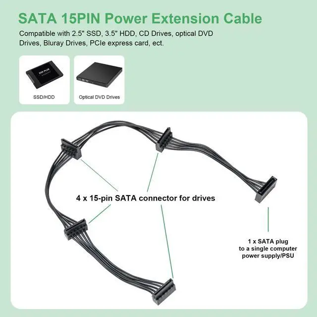 Solution: If you are upgrading or repairing computers, this cable solves the problem by adding more SATA power port to an existing power supply with limited SATA power ports, share PUS power to four SATA hard drive drivers, such as: 2.5 SSD hard drive, 3.5 HDD drive, DVD optical drive.
