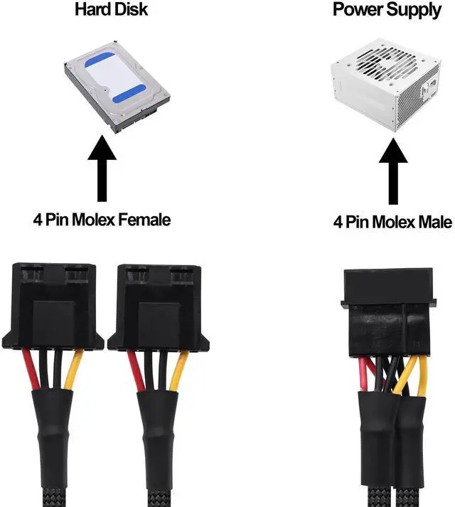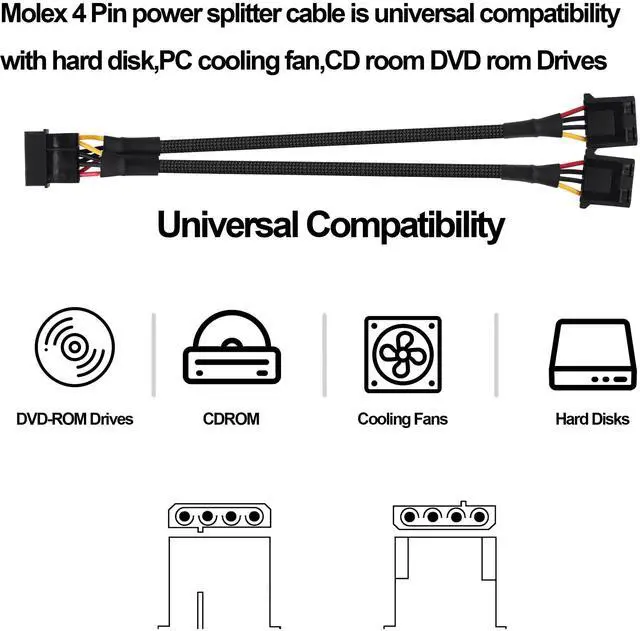 Molex 4 pin power supply Y splitter cable can help you to resolve the issue of insufficient power interface,it expands a IDE 4pin Power interface into 2 independent IDE 4 Pin interfaces