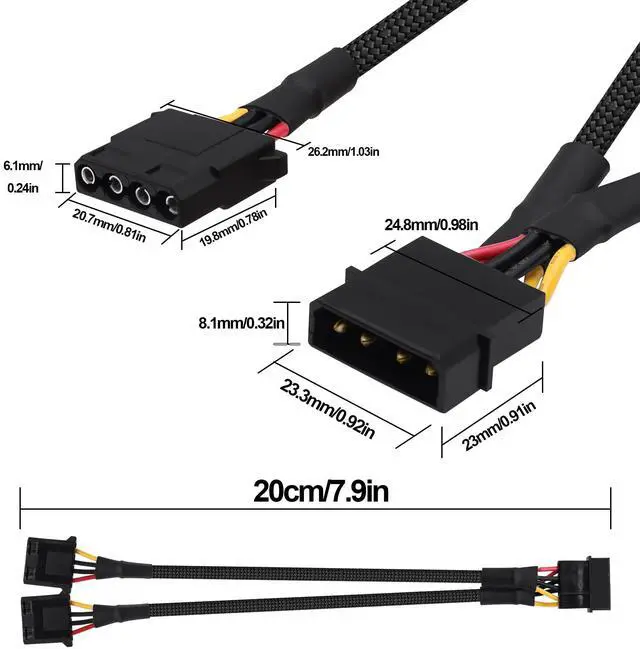 Molex LP4 IDE 4 Pin Power Supply Y Splitter Extension Cable D Type Molex 4 Pin 1 Male to 2 Female Plug Adapter Connector Power Cable for Hard Disks PC Cooling Fans -20cm /2pcs