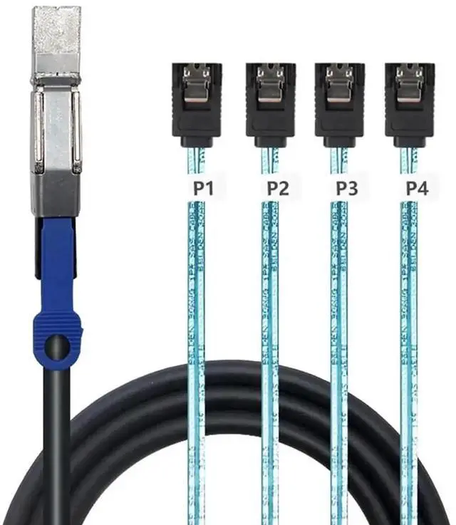 Mini SAS HD to 4 x SATA \u2013 Converts SFF-8644 with IC to four SATA 7-pin connectors, suitable for HDDs, SSDs, and enterprise storage applications.