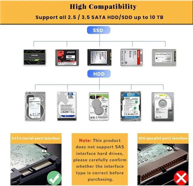 Compatible with all 2.5/3.5 inch HDD/SSD SATA hard drives up to 10TB
