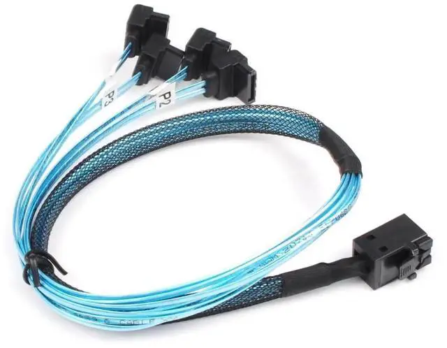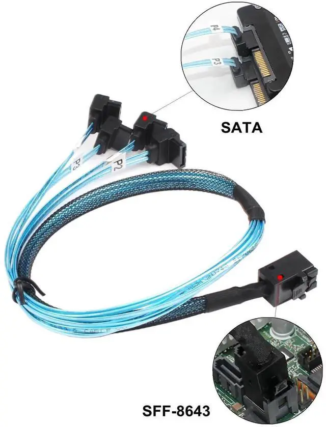 • This Mini SAS (SFF-8643) to 4x SATA Cable, SFF-8643 is host , connect to the motherboard or RAID Controller with Mini SAS ports. 4x7Pin SATA is the target , connect to the hard drives with SATA port