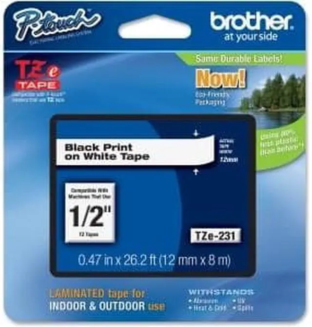 TECHNICAL SPECIFICATIONS: General Information ManufacturerBrother Industries, Ltd Manufacturer Part NumberTZE231 Manufacturer Website Addresshttp://www.brother.ca Brand NameBrother Product SeriesTZ Product ModelTZE231 Product NameTZE231 Label Tape Marketing InformationLaminated tape features standard adhesive designed for flat surfaces like office paper, file folders and binders. Tape resists water, grease and grime. Can also be used in hot and cold environments as well as outdoors (water-resistant). For use with all P-Touch machines. Packaged Quantity1 Each Product TypeLabel Tape Product Information Media Size15/32" Width x 26 1/4 ft Length ShapeRectangle Physical Characteristics ColorBlack,White Miscellaneous RecycledNo Recycled Content0% Post-consumer-waste%0% Assembly RequiredNo Country of OriginJapan