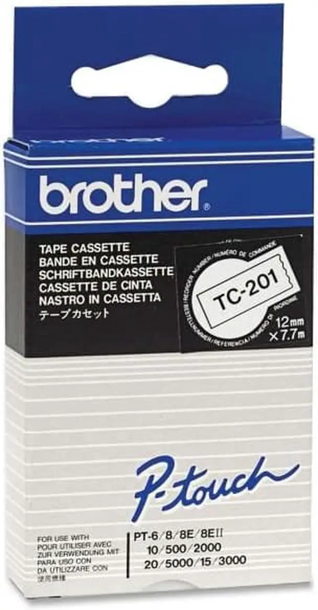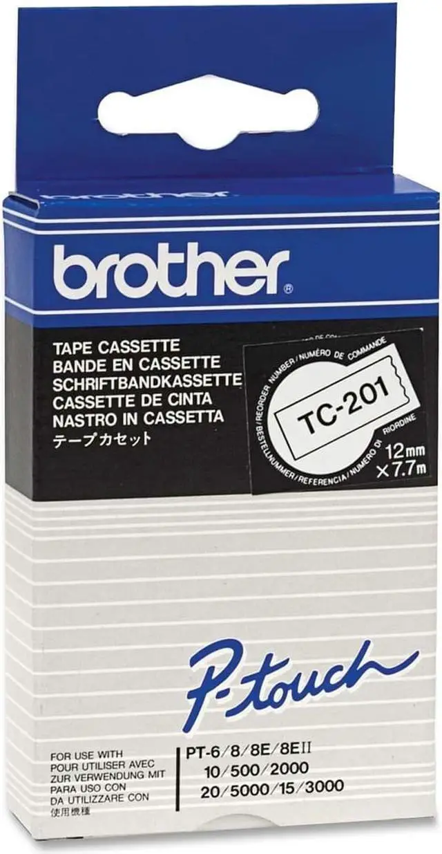 TECHNICAL SPECIFICATIONS: General Information ManufacturerBrother Industries, Ltd Manufacturer Part NumberTC201 Manufacturer Website Addresshttp://www.brother.ca Brand NameBrother Product SeriesTC Product ModelTC201 Product NameP-Touch TC201 Tape Marketing InformationLaminated tape creates self-adhesive laminate labels that stick to any clean, dry surface. Use indoors or outdoors. Tape is designed for flat surfaces like office paper, file folders and binders. It can withstand water, grease or grim abrasion, UV, spills, heat and cold. Use in hot or cold environments. Laminated tape is designed for use in Brother PT-6, PT-15, PT-20 and P5-2000. Packaged Quantity1 Each Product TypeLabel Tape Product Information Media Size15/32" Width x 24 39/64 ft Length FinishingGlossy Physical Characteristics ColorBlack Miscellaneous RecycledNo Assembly RequiredNo