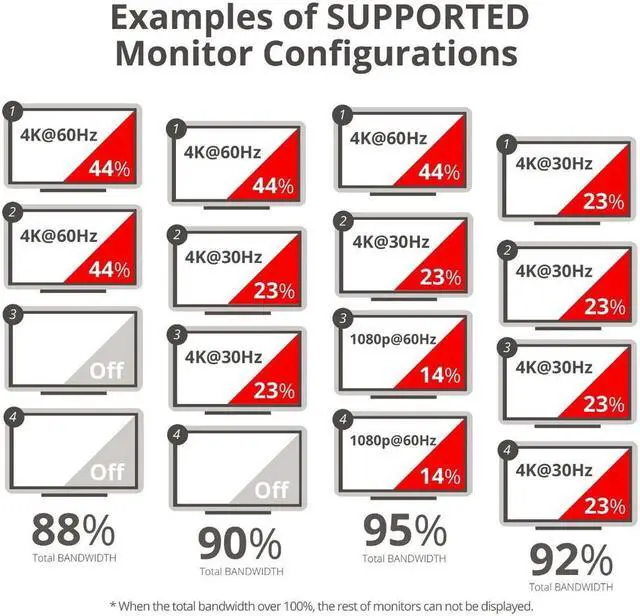 Total Bandwidth 32.4G bps (max): Supports one UHD 8K (7680 x 4320) @30Hz display, two 4K@60Hz displays, three or four 4K (3840x2160) @30Hz or less display. Other resolution combinations which are less than or equal to 4K@30Hz will wor
