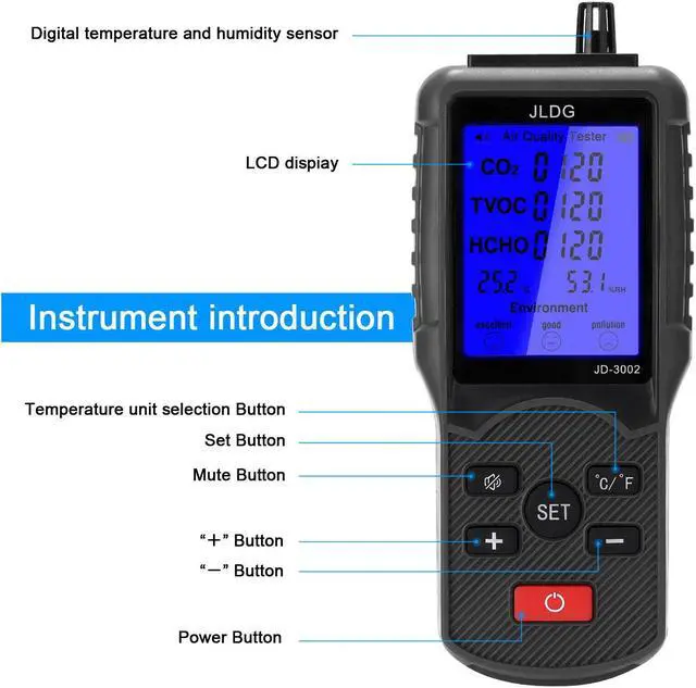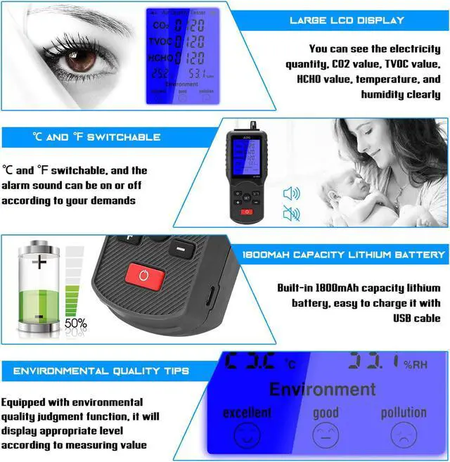 Digital Quality Tester CO2 TVOC Temp Humi Measuring Device Large LCD M5C7