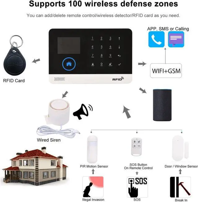 Number of Zones:100:Features:433MHz Wireless WIFI + GSM
