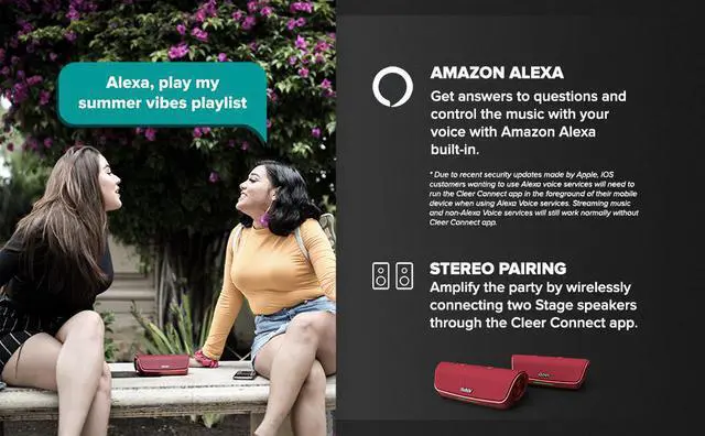 AMAZON ALEXA Get answers to questions and control the music with your voice with Amazon Alexa built-in. POWERFUL SOUND Enjoy distortion-free reproduction of your favorite music thanks to a powerful digital amplifier paired with dual 48mm neodymium drivers and passive radiators. STEREO PAIRING Amplify the party with this Alexa smart speaker by wirelessly connecting two Stage speakers through the Cleer Connect app. Creating a stereo pair provides a richer overall listening experience together. ADVANCED OPERATION With the Cleer Connect App you can easily connect to your Stage speaker to access settings and stereo pair two Stage speakers.
