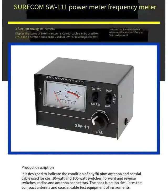 SW111 100W Power VSWR Meter for CB Radio Antennas 50 Ohm Cable Tester with Forward Reverse Switch and Analog Meter Panel