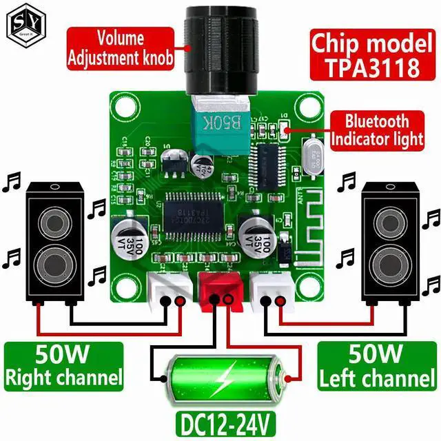 XH-A414 DC12-24V 5.0 Bluetooth digital amplifier board 50W+50W onboard TPA3118D2 amplifier chip 50K dual potentiometer