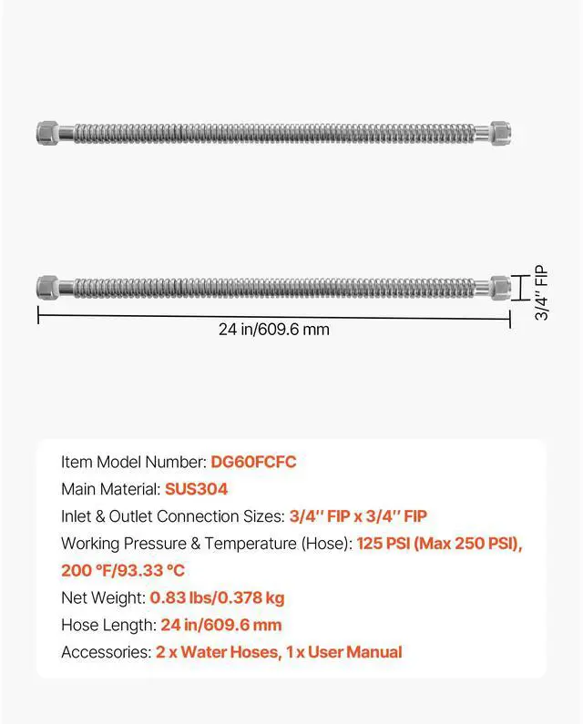 Working Pressure & Temperature (Hose): 125 PSI (Max 250 PSI), 200 / 93.33