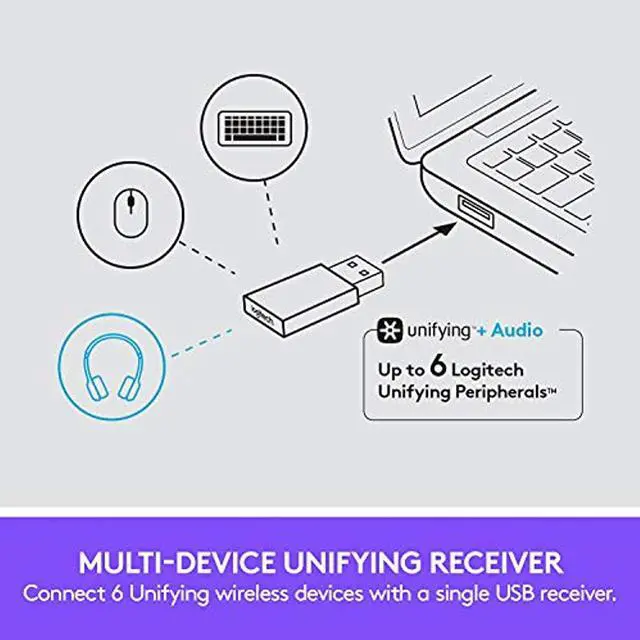 Zone Wireless Plus can connect up to six Logitech Unifying™ wireless peripherals through a single USB Unifying + Audio receiver.