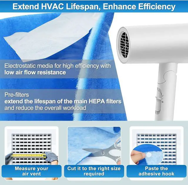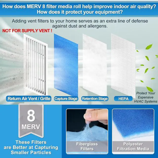 Protect HVAC systems or Other EquipmentUsing MERV 8 vent filters media for home floor reduces the ingress of dust and other particles into equipment, prolonging their lifespan. Replace furnace filters less often by using this layer as a pre-filter for air return vent, A/C, fans, exhaust fan, central AC, furnace vents, floor vents, floor heating air vents, floor register, floor grilles. The filters caught dust, paint particles, and debris while still allowing the HVAC system to do its job!