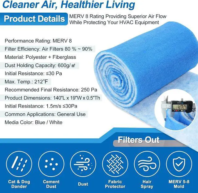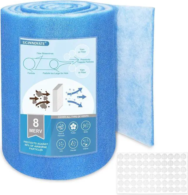 MERV 8 Electrostatic Air Vent FiltersUCINNOVATE 12"W x 140"L x 0.5"T h MERV 8 triple filtration with 80%~90% filter rate which is better at filtering smaller particles like pet dander and pollen, reduce the presence of allergens such as pet hairs, dust, lint, dirt and other airborne particles that may cause sneezing, coughing, and red itchy eyes. Save costs on frequent replacements, we recommend changing your AC vent pre-filter every 3 months or sonner.