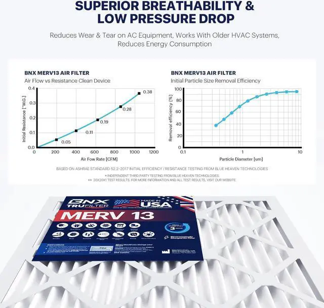 SUPERIOR PERFORMANCE - The BNX MERV 13 air filter media outperforms standard fiberglass filters and adopts the latest in electrostatic filtration technology to capture maximum pollen, mold bacteria, smoke, carriers & other microscopic particles while maintaining industry leading superior low air flow resistance.