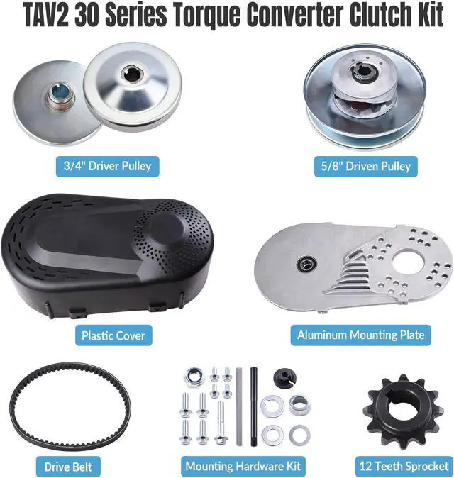 - TAV2 30 Series Torque Converter Clutch Kit - Includes 1pc 3/4" driver pulley, 1pc 5/8" driven pulley, 1pc belt, 1pc aluminum mounting plate, 1pc 12 teeth sprocket and 1 set of screws for directly replacing the old clutch of your go kart or minibike to provide more torque to ensure smoother acceleration and better climbing ability