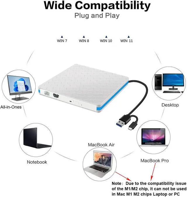 Wide Support: External CD/DVD Drive supports to read CD, VCD, SVCD, CD-R/RW, DVD-R/RW, DVD+R, DVD-R DL and Burn CD+/-RW. (DVD+/-R empty disk is not supported)