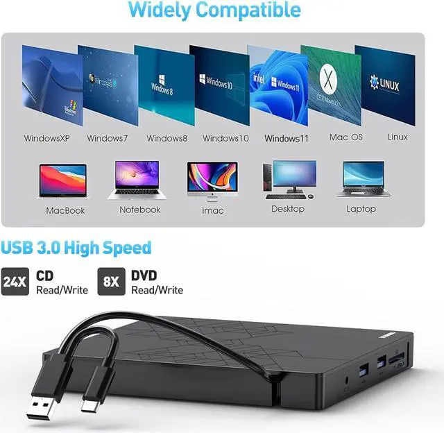 With this external CD/DVD RW Drive, you can read movies DVDs, play music CDs, burn and rip discs, copy photos, install software/games/system, backup data and more. and just slips easily into your travel bag, perfect companion for DVD lovers, using everywhere.