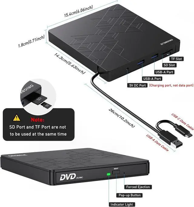 It is not only CD/DVD burner, but also a SD/TF card Reader. Extra built-in SD/TF card slot is perfect for you to transfer photos shooting or videos by your camera from memory cards to your computers