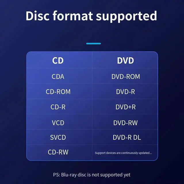 Supported formats: DVD-ROM, DVD-Video, CD-R / RW, CD-ROM / XA, CD-ROM, CD-EXTRA, CD-TEXT