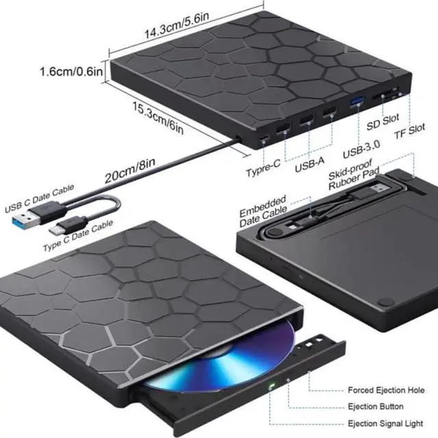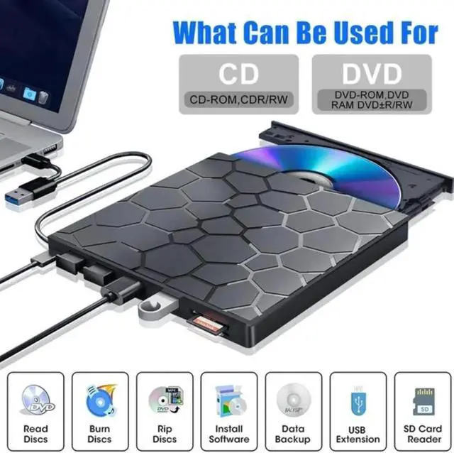 1. Our external optical drive can not only burn and read CDs and DVDs, but also serve as an external USB hub for laptops. It is compatible with USB hard drives, limited/wireless mice and keyboards, computer heat sinks, and other USB computer accessories. The card slot is perfect for transferring camera photos and video files from the card to the computer (note: the SD port and TF port cannot be used simultaneously)