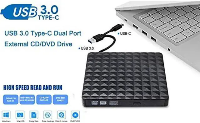 [USB 3 0 & USB C Interface] the USB 3 0 transfer is 10x speed of USB 2 0 which ups to a maximum of 5Gbps compatible with USB 2 0 standards buffer under run protection technology (max 8x dvdr write speed max 24x CD write speed) extra USB C adapter is more convenient for using on your new version laptops